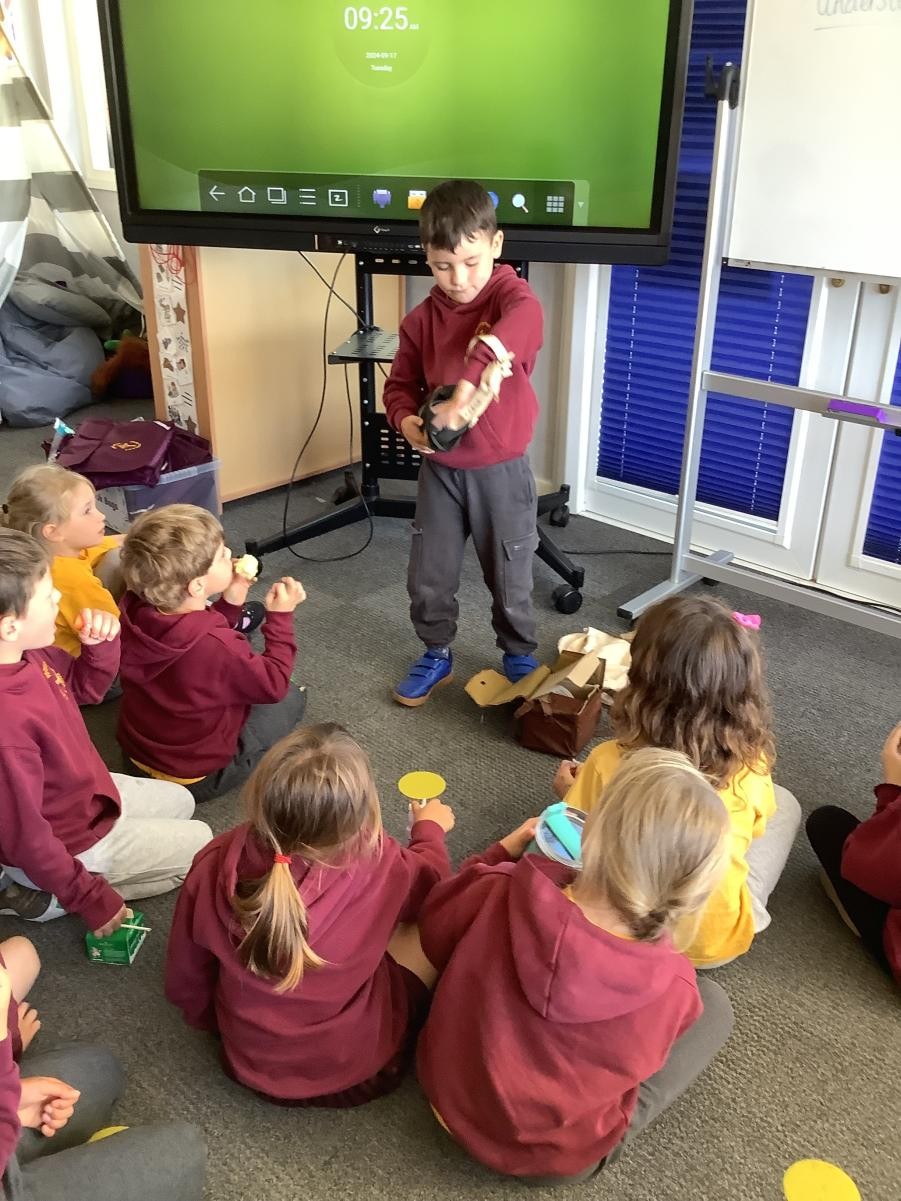 In Class One we have been looking at gas masks and why they were needed during World War II. One of our pupils brought in an actual gas mask that had been used by his great, great grandad. We were shocked at how heavy they were and didn't like the idea of wearing them for a long period of time.